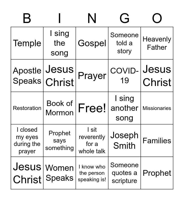 This bingo card has a free space and 24 words: Prophet says something, Women Speaks, Prayer, Jesus Christ, Heavenly Father, Temple, Apostle Speaks, I sing the song, I sing another song, I sit reverently for a whole talk, COVID-19, Restoration, Joseph Smith, Families, Jesus Christ, Someone quotes a scripture, Missionaries, Gospel, Jesus Christ, Book of Mormon, Prophet, I closed my eyes during the prayer, Someone told a story and I know who the person speaking is!.