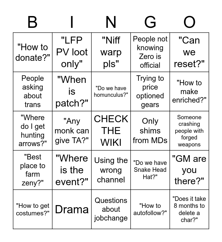 This bingo card has a free space and 24 words: "Where is the event?", Drama, "Do we have homunculus?", "How to get costumes?", "Can we reset?", "How to donate?", People asking about trans, "LFP PV loot only", Only shims from MDs, Using the wrong channel, Trying to price optioned gears, "Where do I get hunting arrows?", "Do we have Snake Head Hat?", "GM are you there?", "When is patch?", "How to autofollow?", Someone crashing people with forged weapons, "Niff warp pls", "How to make enriched?", "Any monk can give TA?", "Does it take 8 months to delete a char?", "Best place to farm zeny?", People not knowing Zero is official and Questions about jobchange.