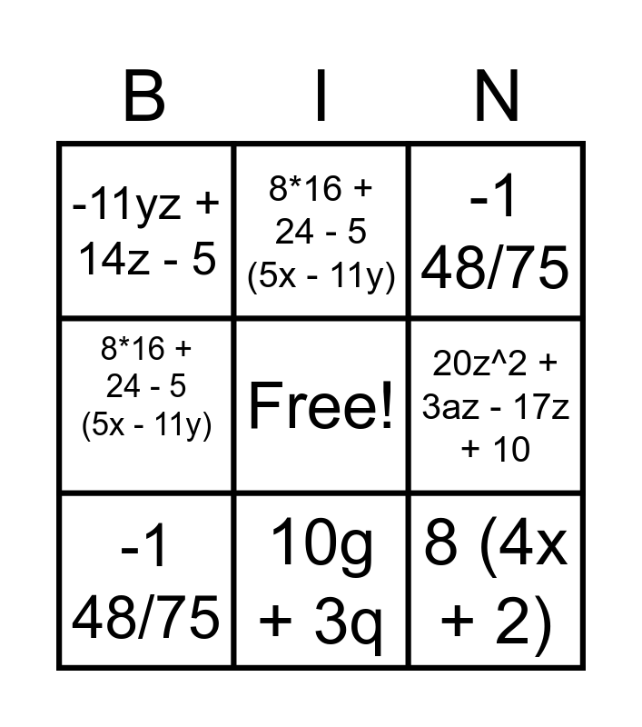 This bingo card has a free space and 16 words: -755, 3y - 4^2 + 4x, -1 48/75, -11yz + 14z - 5, 8 (4x + 2), 8*16 + 24 - 5 (5x - 11y), 10g + 3q, 20z^2 + 3az - 17z + 10, 8 (4x + 2), 8*16 + 24 - 5 (5x - 11y), -775, -1 48/75, 10g + 3q, 20z^2 + 3az - 17z + 10, 3y - 4^2 + 4x and -11yz + 14z - 5.