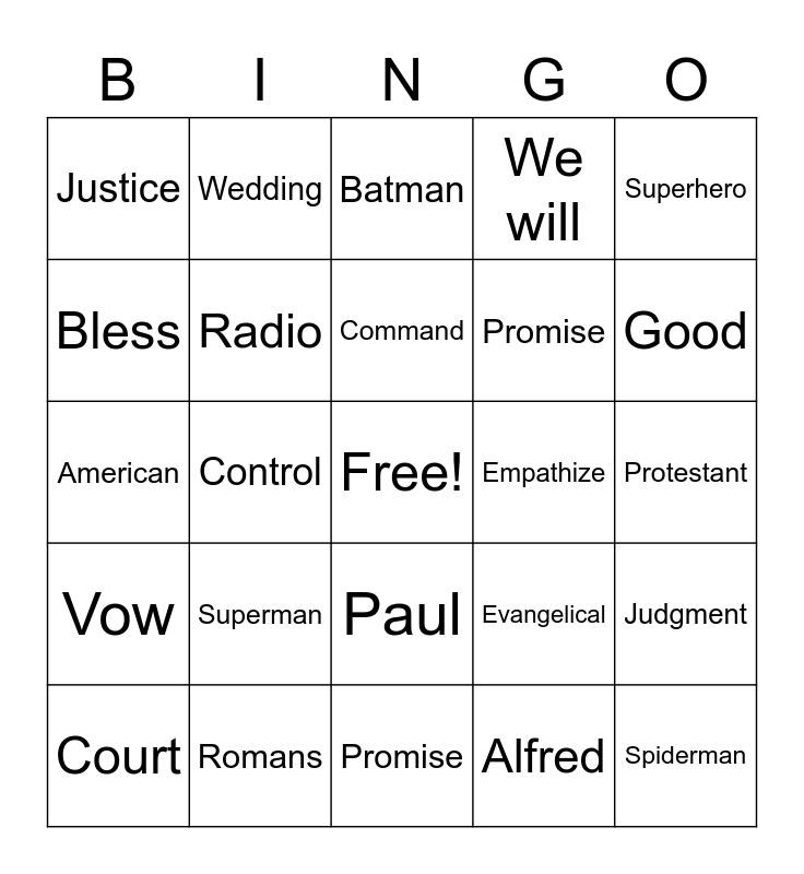 This bingo card has a free space and 29 words: Court, Evil, Control, Bless, Justice, Batman, Radio, Superman, Empathize, Romans, Protestant, Spiderman, Promise, Alfred, Good, Global, Paul, Vow, Superhero, American, Evangelical, Neighbor, Promise, Bless, We will, Wedding, Judgment, Command and Politics.