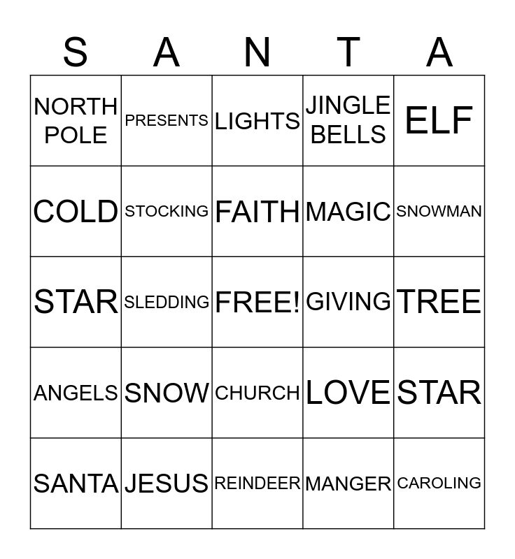 This bingo card has a free space and 24 words: SNOW, JESUS, FAITH, SANTA, ELF, NORTH POLE, COLD, PRESENTS, GIVING, CHURCH, MAGIC, STAR, LOVE, STAR, STOCKING, MANGER, TREE, LIGHTS, SNOWMAN, SLEDDING, CAROLING, ANGELS, JINGLE BELLS and REINDEER.