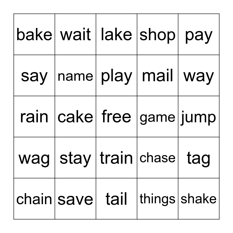 This bingo card has a free space and 24 words: stay, save, play, chain, pay, bake, say, wait, game, train, mail, rain, chase, tag, name, things, jump, lake, way, cake, shake, wag, shop and tail.