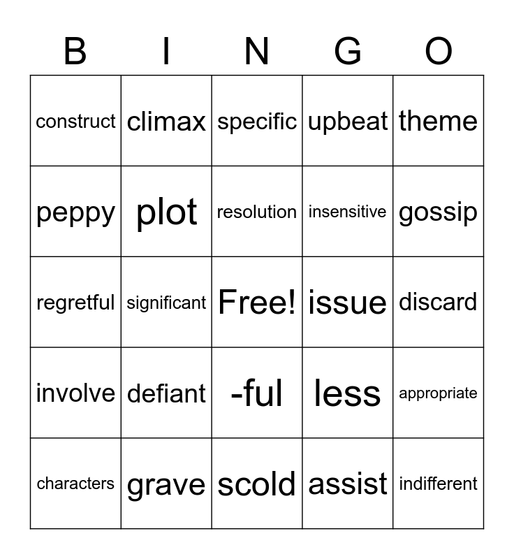 This bingo card has a free space and 34 words: establish, assist, focus, perceive, involve, plot, theme, characters, climax, rising action, resolution, specific, complex, role, issue, gossip, grave, regretful, defiant, less, -ful, hesitate, construct, discard, scold, indifferent, upbeat, heartless, insensitive, peppy, cheerful, significant, appropriate and tradition.