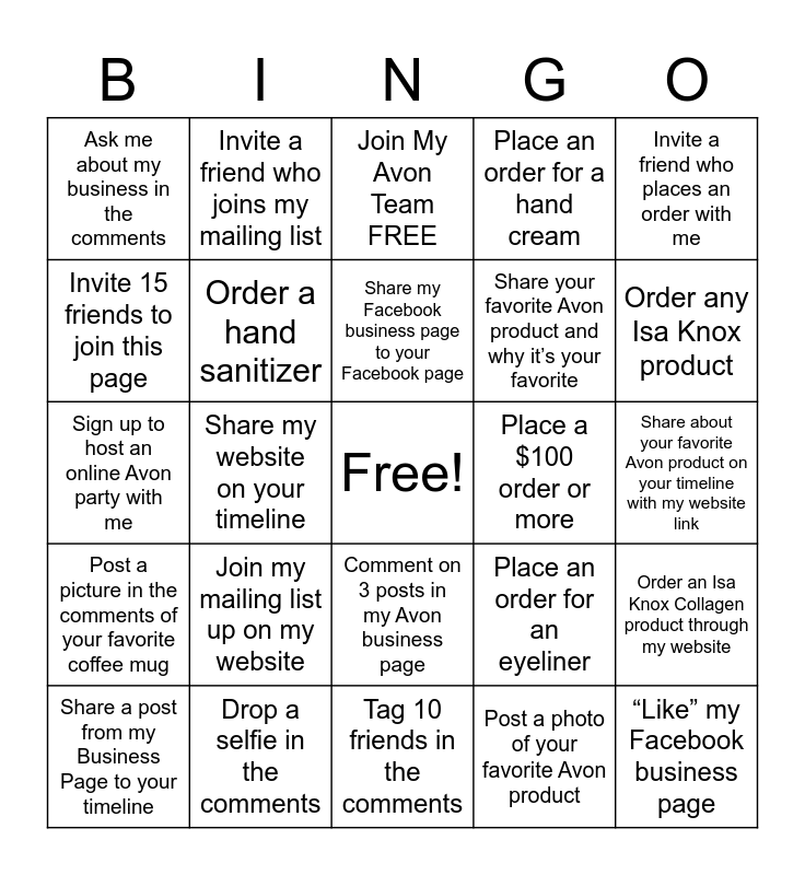 This bingo card has a free space and 24 words: Join my mailing list up on my website, Drop a selfie in the comments, Share my Facebook business page to your Facebook page, Share a post from my Business Page to your timeline, Invite a friend who places an order with me, Ask me about my business in the comments, Invite 15 friends to join this page, Invite a friend who joins my mailing list, Place a $100 order or more, Comment on 3 posts in my Avon business page, Share your favorite Avon product and why it’s your favorite, Sign up to host an online Avon party with me, Place an order for an eyeliner, Order an Isa Knox Collagen product through my website, Order a hand sanitizer, Post a photo of your favorite Avon product, Share about your favorite Avon product on your timeline with my website link, Join My Avon Team FREE, Order any Isa Knox product, Share my website on your timeline, “Like” my Facebook business page, Post a picture in the comments of your favorite coffee mug, Place an order for a hand cream and Tag 10 friends in the comments.