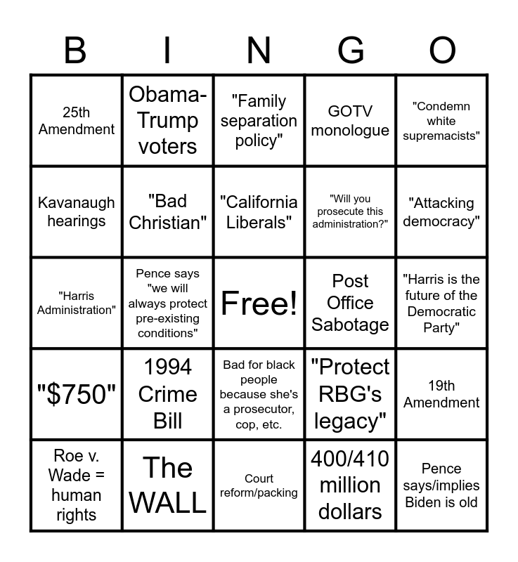 This bingo card has a free space and 39 words: "Ready on Day 1", Harris is accused of "playing the race card", Tiebreaker Senate Vote, "Bad Christian", Roe v. Wade = human rights, Bad for black people because she's a prosecutor, cop, etc., "California Liberals", "Restore the Voting Rights Act", "Condemn white supremacists", "$750", Pence says "we will always protect pre-existing conditions", GOTV monologue, Pence says/implies Biden is old, "Harris is the future of the Democratic Party", Post Office Sabotage, 1994 Crime Bill, "Soldiers are losers", 25th Amendment, Trump and Pence are called "irresponsible", "Protect RBG's legacy", Kavanaugh hearings, Court reform/packing, "Will you prosecute this administration?", "Attacking democracy", Democrats will raise taxes, "Antifa terrorists", Reparations, "Law and order", Harris highlights that she's a prosecutor, cop, etc., Obama-Trump voters, White working class voters in the Mid-west, "Joe Biden's America", "Family separation policy", The WALL, 400/410 million dollars, 200,000 dead, 19th Amendment, "Harris Administration" and The Census.