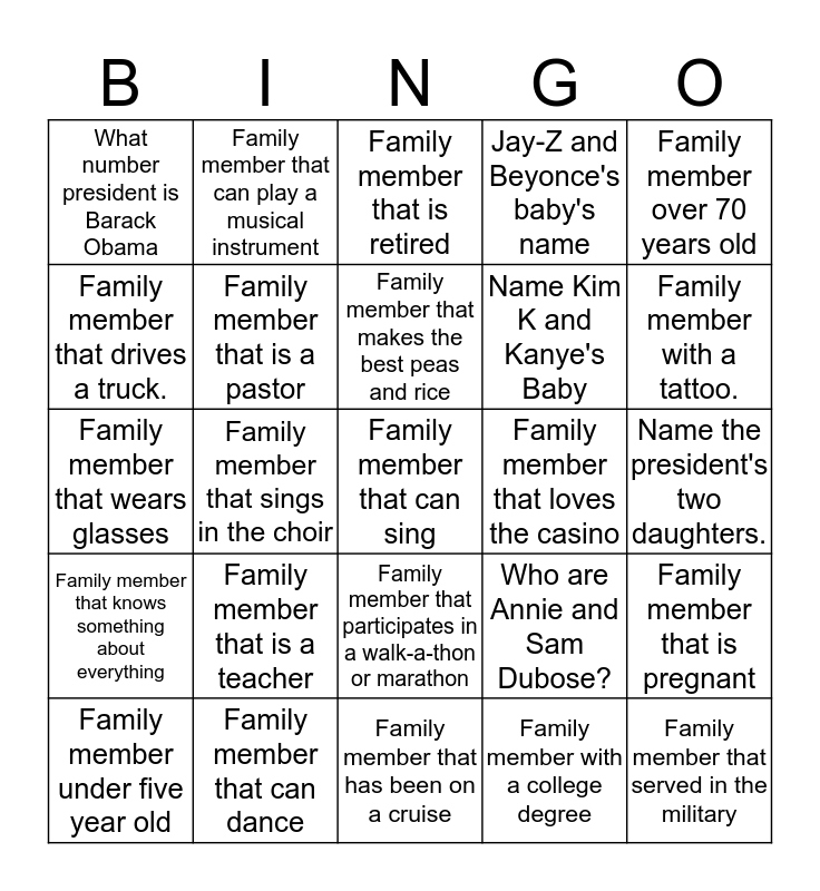 This bingo card has 25 words: Family member that is a teacher, Family member that has been on a cruise, Family member that makes the best peas and rice, Family member under five year old, Family member over 70 years old, What number president is Barack Obama, Family member that drives a truck., Family member that can play a musical instrument, Family member that loves the casino, Family member that participates in a walk-a-thon or marathon, Name Kim K and Kanye's Baby, Family member that wears glasses, Who are Annie and Sam Dubose?, Family member that is pregnant, Family member that is a pastor, Family member that served in the military, Name the president's two daughters., Family member that is retired, Family member with a tattoo., Family member that sings in the choir, Family member that can sing, Family member that can dance, Family member that knows something about everything, Jay-Z and Beyonce's baby's name and Family member with a college degree.
