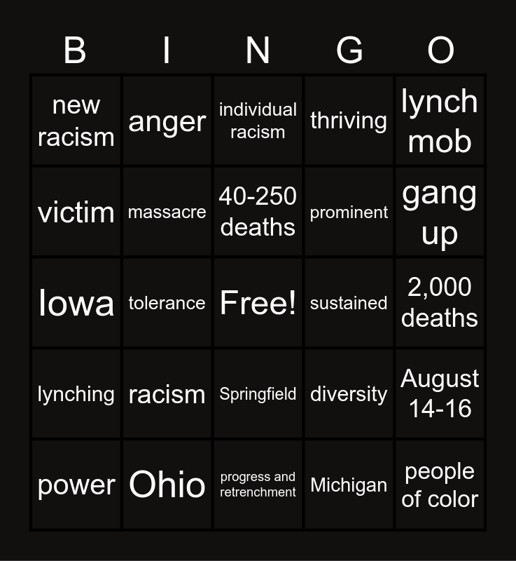 This bingo card has a free space and 87 words: Chicago, 1919, Springfield, 1908, East St. Louis, 1917, Detroit, 1943, race riot, Red Summer, July 27- Aug. 3, 38 deaths, August 14-16, 2,000 deaths, May 28, July 1-3, 40-250 deaths, 34 deaths, toll, NAACP, Midwest, Indiana, Illinois, Iowa, Kansas, Michigan, Minnesota, Missouri, Nebraska, North Dakota, South Dakota, Ohio, Wisconsin, 12 states, racism, victim, mob, gang up, violence, hatred, tolerance, homeless, murder, indictment, sustained, black, lynch mob, fight, anger, Segregation, race relations, Jim Crow Laws, discrimination, lynching, propaganda, injury, rebuild, prominent, assault, allow, thriving, massacre, justice, bias, prejudice, racial profiling, racial equity, culture, power, people of color, structural racism, systemic racism, institutional racism, individual racism, diversity, ethnicity, cultural representations, national values, progress and retrenchment, color blind, color conscious, dog whistle, antiracism, implicit bias, intersectionality, microaggression, new racism and Reparations.