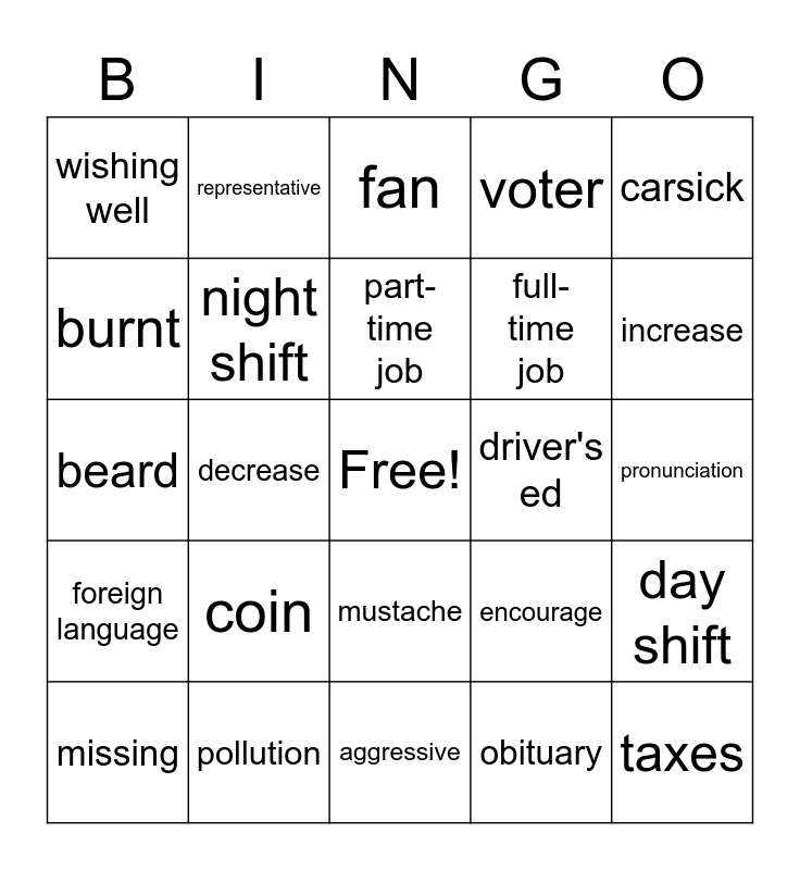 This bingo card has a free space and 24 words: coin, pollution, part-time job, missing, carsick, wishing well, burnt, representative, driver's ed, mustache, full-time job, beard, encourage, day shift, night shift, obituary, pronunciation, fan, increase, decrease, taxes, foreign language, voter and aggressive.