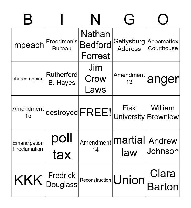 This bingo card has a free space and 25 words: poll tax, Reconstruction, Jim Crow Laws, KKK, Appomattox Courthouse, impeach, sharecropping, Freedmen's Bureau, Fisk University, Amendment 14, Amendment 13, Amendment 15, martial law, Andrew Johnson, Rutherford B. Hayes, veto, William Brownlow, Nathan Bedford Forrest, anger, destroyed, Clara Barton, Fredrick Douglass, Emancipation Proclamation, Gettysburg Address and Union.