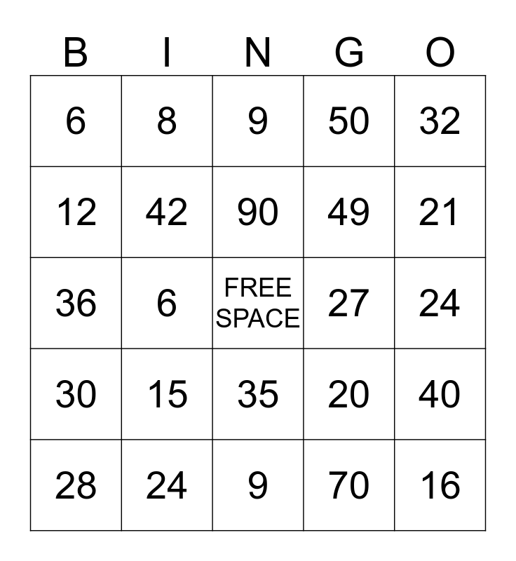 This bingo card has a free space and 24 words: 15, 24, 90, 28, 32, 6, 12, 8, 27, 35, 49, 36, 20, 40, 42, 70, 24, 9, 21, 6, 16, 30, 50 and 9.