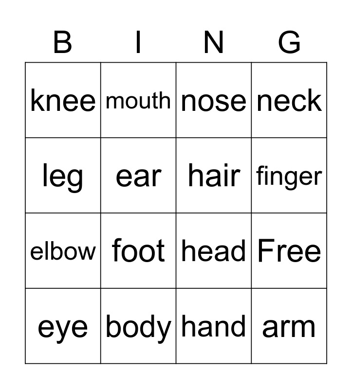 This bingo card has 16 words: body, Free, nose, knee, elbow, mouth, head, hand, leg, ear, eye, neck, foot, finger, hair and arm.