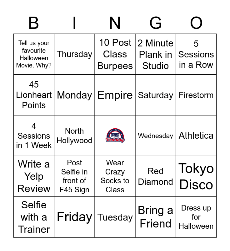 This bingo card has a free space and 24 words: Post Selfie in front of F45 Sign, Friday, Empire, Selfie with a Trainer, 5 Sessions in a Row, Tell us your favourite Halloween Movie. Why?, 45 Lionheart Points, Thursday, Wednesday, Wear Crazy Socks to Class, Saturday, 4 Sessions in 1 Week, Red Diamond, Tokyo Disco, Monday, Bring a Friend, Athletica, 10 Post Class Burpees, Firestorm, North Hollywood, Dress up for Halloween, Write a Yelp Review, 2 Minute Plank in Studio and Tuesday.