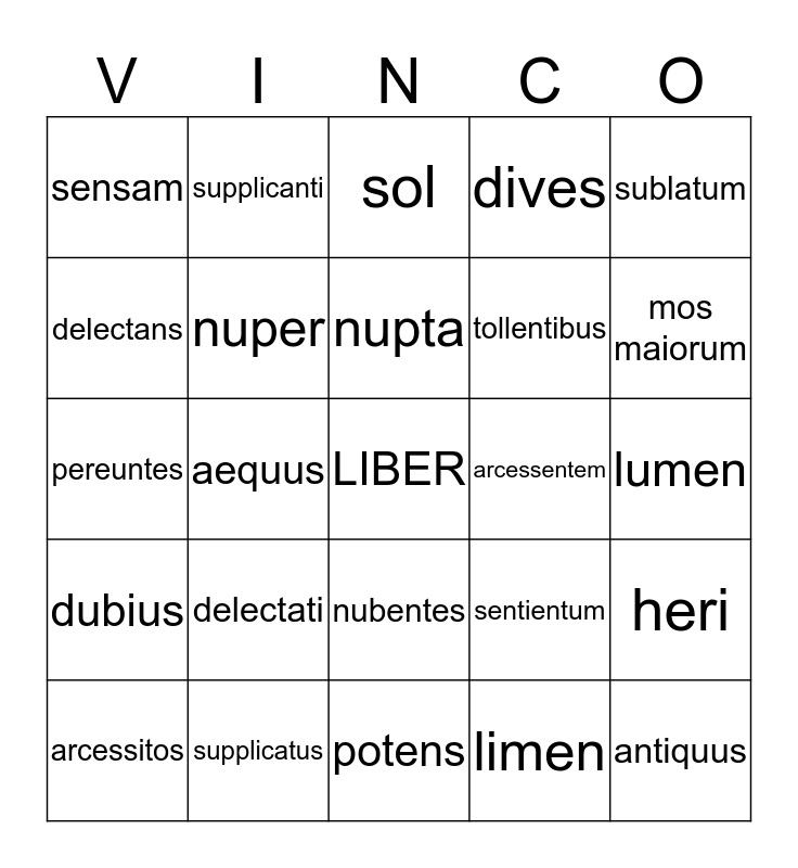 This bingo card has a free space and 24 words: delectati, supplicatus, nupta, arcessitos, sublatum, sensam, delectans, supplicanti, arcessentem, nubentes, tollentibus, pereuntes, sentientum, heri, nuper, limen, lumen, sol, mos maiorum, aequus, antiquus, dubius, dives and potens.
