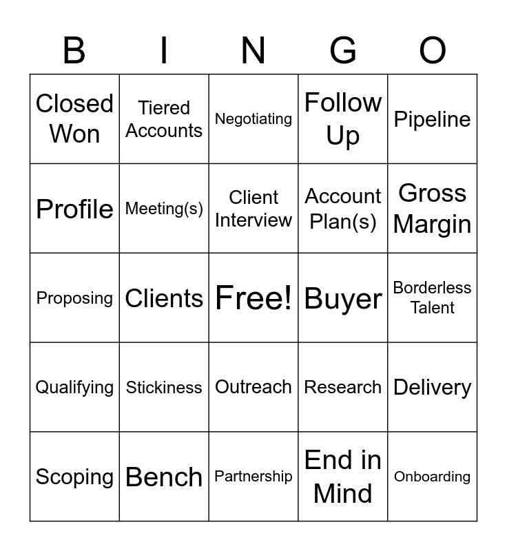 This bingo card has a free space and 24 words: Stickiness, Bench, Client Interview, Scoping, Pipeline, Closed Won, Profile, Tiered Accounts, Buyer, Outreach, Account Plan(s), Proposing, Research, Delivery, Meeting(s), End in Mind, Borderless Talent, Negotiating, Gross Margin, Clients, Onboarding, Qualifying, Follow Up and Partnership.