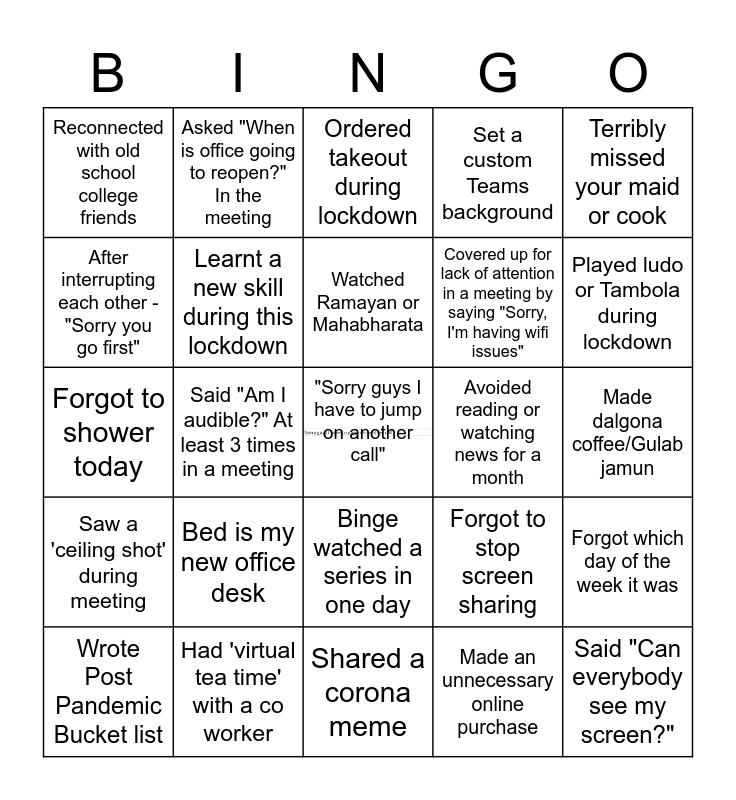 This bingo card has a free space and 24 words: Bed is my new office desk, Had 'virtual tea time' with a co worker, Watched Ramayan or Mahabharata, Wrote Post Pandemic Bucket list, Terribly missed your maid or cook, Reconnected with old school college friends, After interrupting each other - "Sorry you go first", Asked "When is office going to reopen?" In the meeting, Avoided reading or watching news for a month, Binge watched a series in one day, Covered up for lack of attention in a meeting by saying "Sorry, I'm having wifi issues", Forgot to shower today, Forgot to stop screen sharing, Forgot which day of the week it was, Learnt a new skill during this lockdown, Made an unnecessary online purchase, Made dalgona coffee/Gulab jamun, Ordered takeout during lockdown, Played ludo or Tambola during lockdown, Said "Am I audible?" At least 3 times in a meeting, Said "Can everybody see my screen?", Saw a 'ceiling shot' during meeting, Set a custom Teams background and Shared a corona meme.