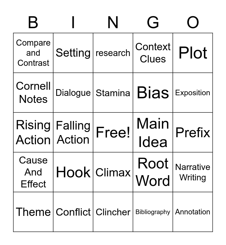This bingo card has a free space and 24 words: Hook, Conflict, Stamina, Theme, Plot, Compare and Contrast, Cornell Notes, Setting, Main Idea, Climax, Bias, Rising Action, Root Word, Narrative Writing, Dialogue, Bibliography, Prefix, research, Exposition, Falling Action, Annotation, Cause And Effect, Context Clues and Clincher.
