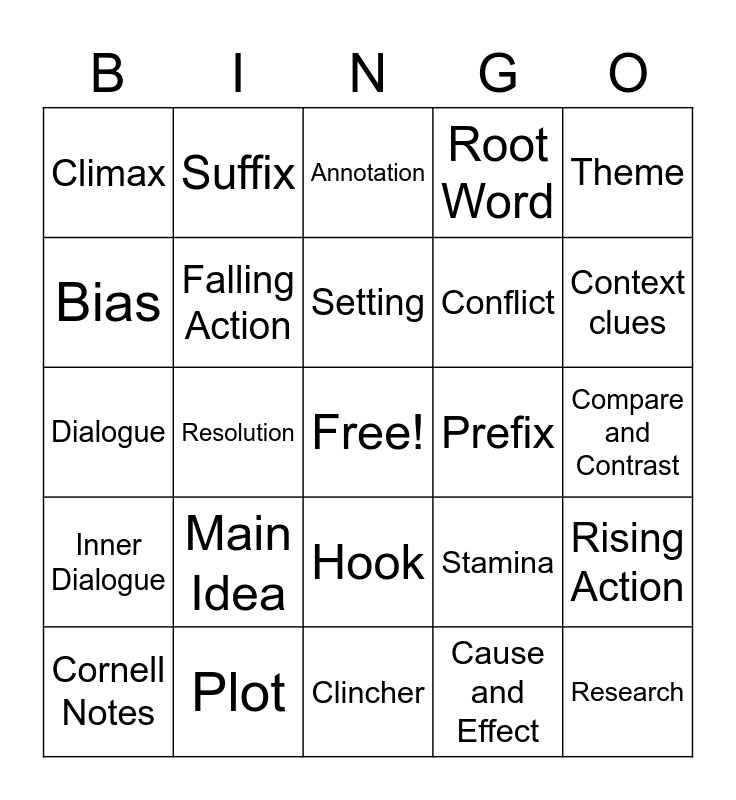 This bingo card has a free space and 24 words: Main Idea, Plot, Setting, Cornell Notes, Theme, Climax, Bias, Suffix, Prefix, Hook, Conflict, Dialogue, Stamina, Rising Action, Falling Action, Cause and Effect, Compare and Contrast, Annotation, Context clues, Resolution, Research, Inner Dialogue, Root Word and Clincher.