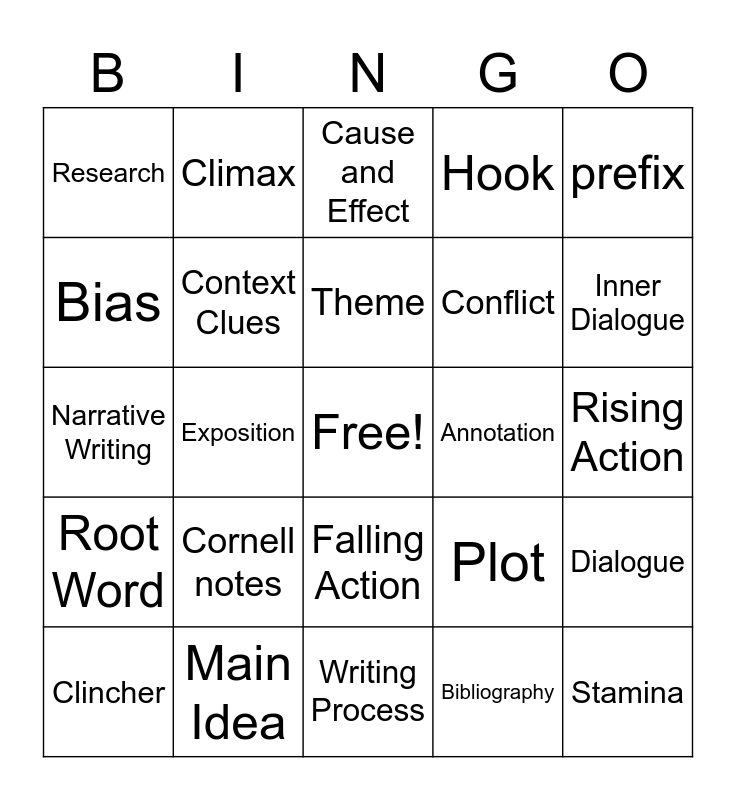This bingo card has a free space and 24 words: Cornell notes, Main Idea, Theme, Clincher, prefix, Research, Bias, Climax, Annotation, Falling Action, Conflict, Narrative Writing, Plot, Dialogue, Context Clues, Bibliography, Rising Action, Cause and Effect, Inner Dialogue, Exposition, Stamina, Root Word, Hook and Writing Process.