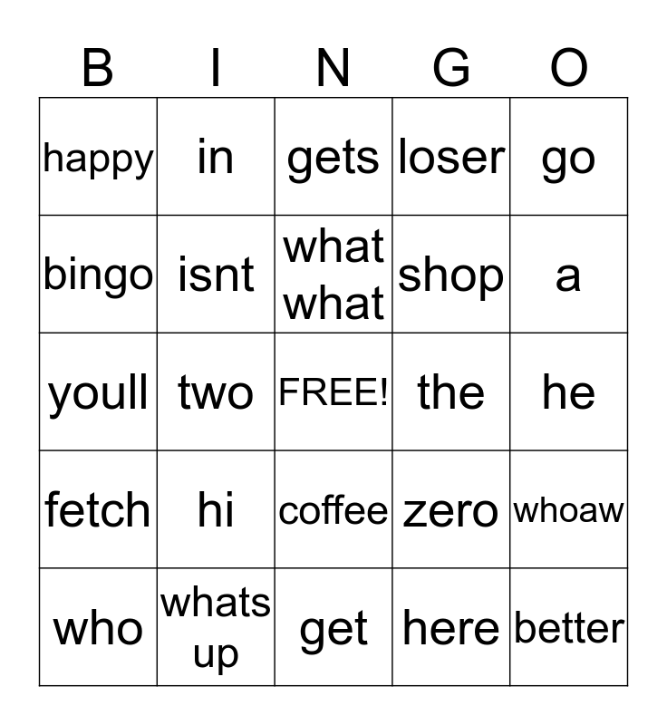 This bingo card has a free space and 24 words: hi, whats up, what what, who, go, happy, bingo, in, the, coffee, shop, youll, zero, whoaw, isnt, here, he, gets, a, two, better, fetch, loser and get.