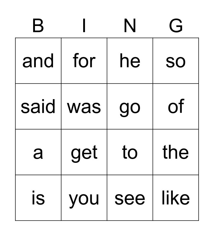 This bingo card has 16 words: is, you, he, so, said, for, to, the, and, was, see, of, a, get, go and like.