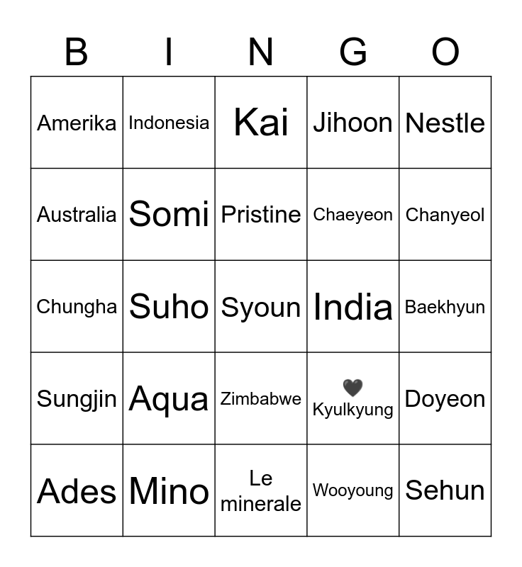 This bingo card has 25 words: Aqua, Le minerale, Pristine, Ades, Nestle, Amerika, Australia, Indonesia, India, Zimbabwe, Chaeyeon, Chungha, 🖤 Kyulkyung, Doyeon, Somi, Sehun, Baekhyun, Kai, Chanyeol, Suho, Syoun, Mino, Sungjin, Jihoon and Wooyoung.
