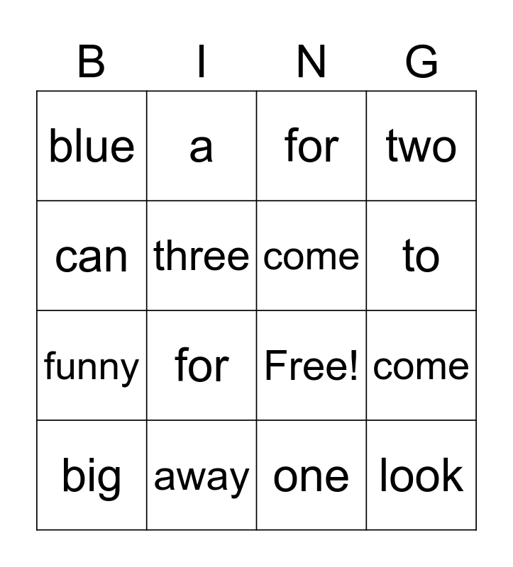 This bingo card has 22 words: away, not, a, big, three, come, blue, for, Free!, look, funny, two, can, play, one, to, come, big, for, can, to and play.
