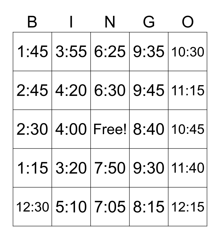 This bingo card has a free space and 24 words: 12:30, 3:20, 6:30, 8:15, 10:30, 1:45, 3:55, 6:25, 8:40, 10:45, 2:30, 4:20, 9:30, 11:40, 2:45, 5:10, 7:05, 9:35, 11:15, 1:15, 4:00, 7:50, 9:45 and 12:15.