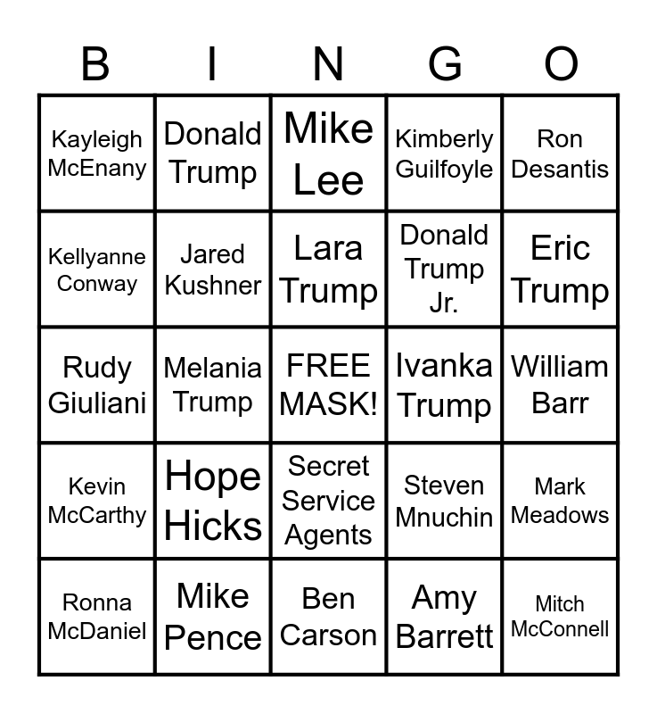 This bingo card has a free space and 27 words: Steven Mnuchin, Thom Tillis, Donald Trump Jr., Ben Carson, Kellyanne Conway, Mike Lee, Donald Trump, Kevin McCarthy, Ivanka Trump, Mark Meadows, Rudy Giuliani, Kimberly Guilfoyle, Ronna McDaniel, Mike Pence, Eric Trump, Bill Stepien, Jared Kushner, Lara Trump, Hope Hicks, Kayleigh McEnany, William Barr, Amy Barrett, Melania Trump, Mitch McConnell, Secret Service Agents, Ron Desantis and Marjorie Greene.