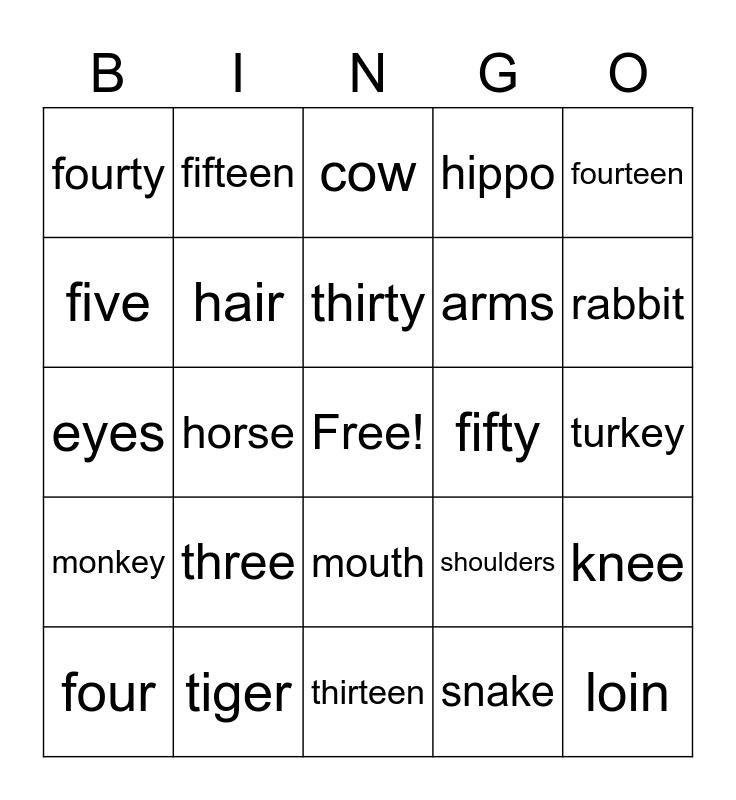 This bingo card has a free space and 25 words: three, thirteen, thirty, four, fourteen, fourty, five, fifteen, fifty, mouth, arms, eyes, shoulders, knee, hair, pig, turkey, cow, rabbit, horse, loin, tiger, monkey, hippo and snake.