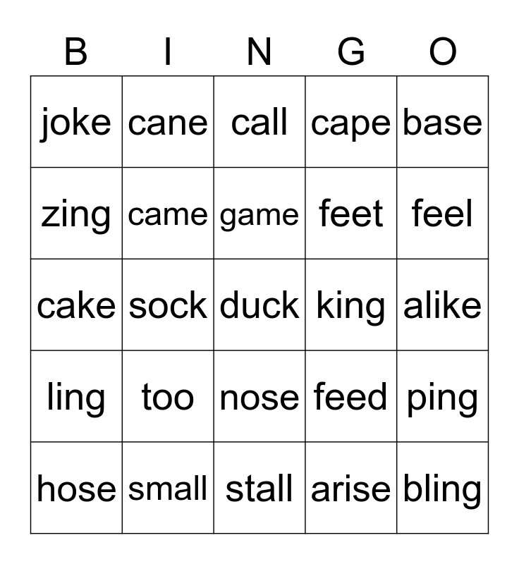 This bingo card has 76 words: Free!, ball, call, fall, wall, lake, flame, brave, gate, ring, bling, sing, game, zing, brick, sock, neck, duck, bake, base, cage, cake, came, cane, cape, case, cave, date, bee, see, beef, beep, deep, feed, feel, feet, free, wise, alike, arise, bride, chime, crime, drive, glide, knife, hose, joke, lobe, mole, mope, nose, note, pole, poke, tune, chute, fluke, flume, flute, too, pool, room, moon, soon, food, king, ring, wing, sing, ping, ling, small, shall, stall and spall.