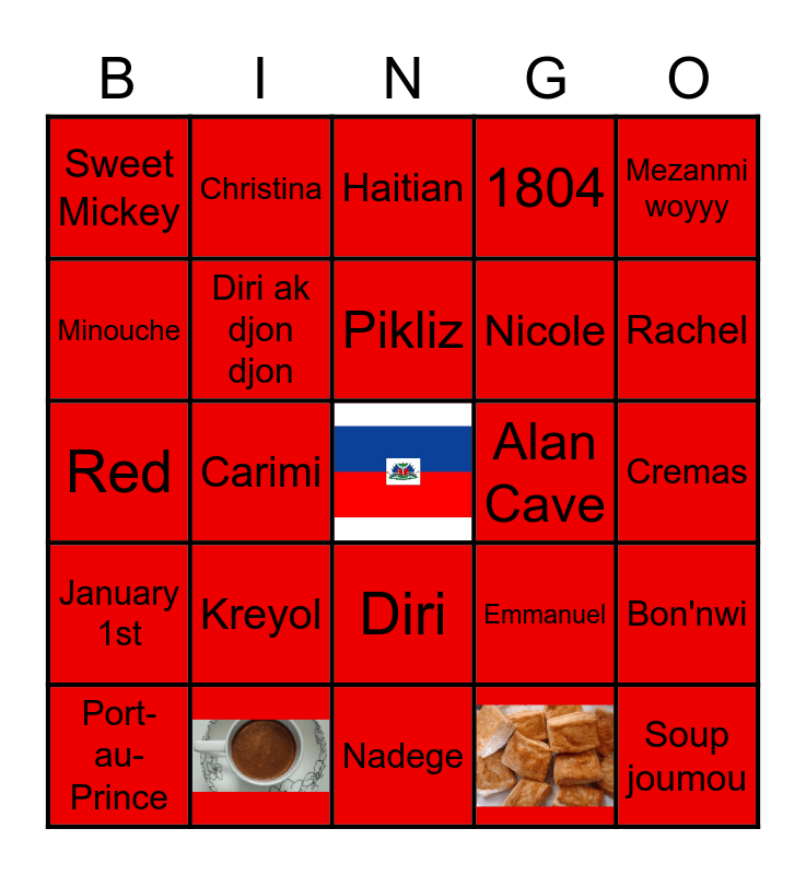 This bingo card has 3 images, a free space and 36 words: Mayi Moulen, Sos pwa, Griot, Diri ak djon djon, Port-au-Prince, Diri, Pikliz, Pwason, Mezanmi woyyy, January 1st, Carimi, 1804, Soup joumou, Cremas, Alan Cave, Kreyol, Sweet Mickey, Jeff, Emmanuel, Minouche, Nadege, Nicole, Rachel, Ruthy, Pastor Naomi, Sabine, Sandra, Bonjou, Christina, Boullion, Haiti, Haitian, Bonswa, Bon'nwi, Red and Blue.