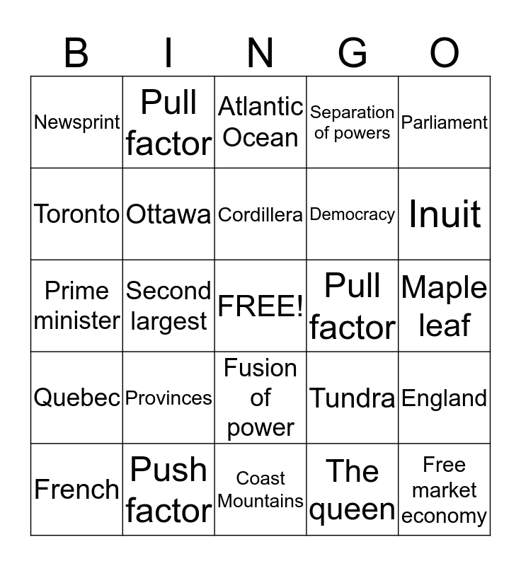 This bingo card has a free space and 24 words: Provinces, Push factor, Cordillera, French, Parliament, Newsprint, Toronto, Pull factor, Pull factor, Fusion of power, Democracy, Prime minister, Tundra, England, Ottawa, The queen, Maple leaf, Atlantic Ocean, Inuit, Second largest, Free market economy, Quebec, Separation of powers and Coast Mountains.