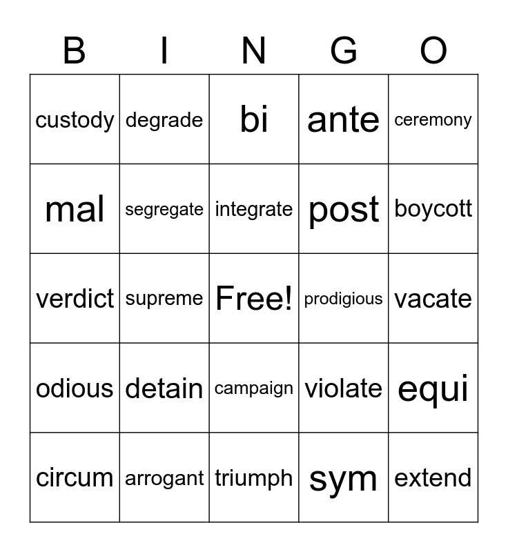 This bingo card has a free space and 24 words: detain, arrogant, integrate, circum, ceremony, custody, mal, degrade, prodigious, campaign, post, verdict, violate, equi, segregate, sym, vacate, bi, boycott, supreme, extend, odious, ante and triumph.