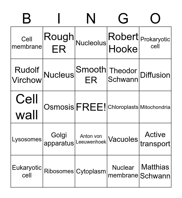 This bingo card has a free space and 24 words: Golgi apparatus, Ribosomes, Smooth ER, Eukaryotic cell, Prokaryotic cell, Cell membrane, Rudolf Virchow, Rough ER, Chloroplasts, Anton von Leeuwenhoek, Theodor Schwann, Cell wall, Vacuoles, Active transport, Nucleus, Nuclear membrane, Mitochondria, Nucleolus, Diffusion, Osmosis, Matthias Schwann, Lysosomes, Robert Hooke and Cytoplasm.