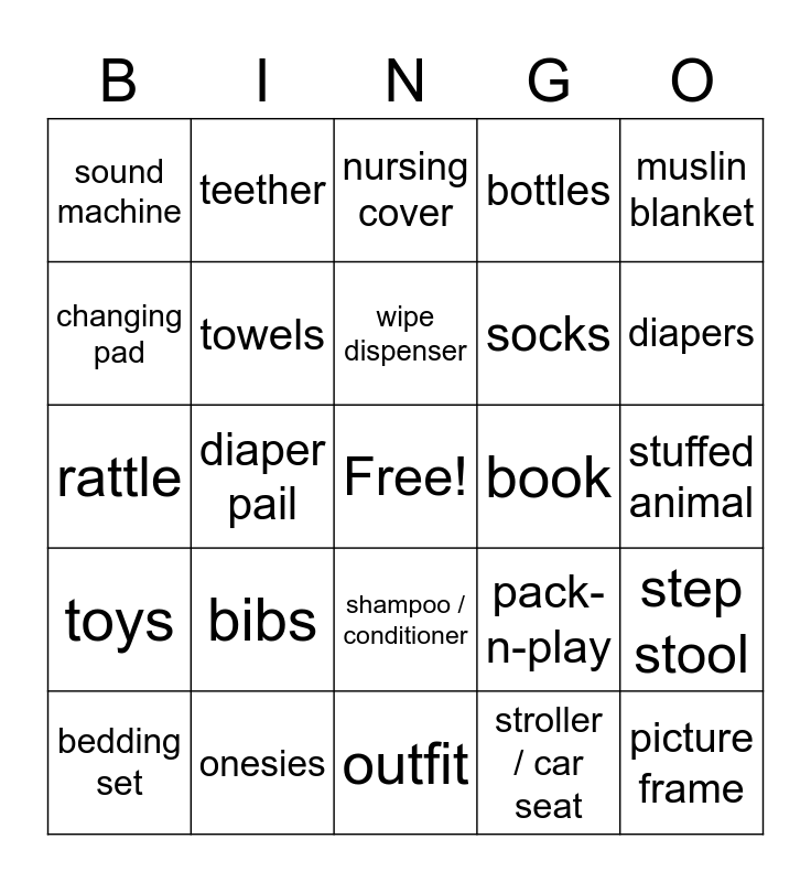 This bingo card has a free space and 34 words: mattress, stroller / car seat, laundry soap, diaper bag, toys, towels, muslin blanket, bedding set, teether, pacifier, wipe dispenser, nursing cover, swing, swaddle, book, diapers, onesies, rattle, bibs, pack-n-play, shampoo / conditioner, wipes, sound machine, stuffed animal, outfit, picture frame, bottles, winter hat / gloves, socks, changing pad, cloth diapers, diaper pail, step stool and fridababy.