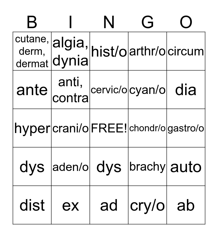 This bingo card has a free space and 46 words: a, an, ab, abdomin, ad, aden/o, al, eal, iac, ic, ior, algia, dynia, ankyl/o, ante, anter/o, anti, contra, arthr/o, auto, brachy, cardi/o, cephal/o, cervic/o, chondr/o, chrom/o, circum, crani/o, cry/o, cutane, derm, dermat, cyan/o, cyt/o, dia, dist, dors/o, dys, dys, ectomy, endo, endo, epi, erythr/o, ex, gastro/o, gram, hemat/o, hem/o, hemi, hepat/o, hist/o, hyper, hypo, ia and ian.
