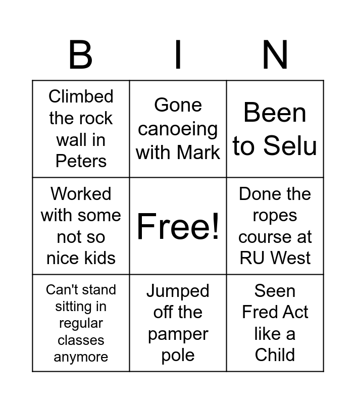 This bingo card has a free space and 8 words: Done the ropes course at RU West, Been to Selu, Gone canoeing with Mark, Can't stand sitting in regular classes anymore, Climbed the rock wall in Peters, Seen Fred Act like a Child, Worked with some not so nice kids and Jumped off the pamper pole.