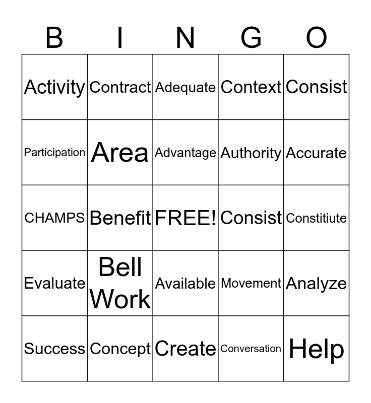 This bingo card has a free space and 24 words: Bell Work, Concept, Advantage, Success, Consist, Activity, Participation, Contract, Consist, Available, Authority, CHAMPS, Movement, Analyze, Area, Conversation, Constitiute, Adequate, Accurate, Benefit, Help, Evaluate, Context and Create.