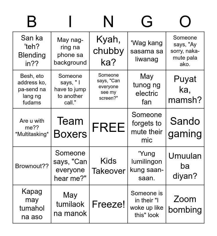 This bingo card has a free space and 24 words: Someone says, "Can everyone hear me?", May tumilaok na manok, Someone says, "Can everyone see my screen?", Kapag may tumahol na aso, Someone says, "Ay sorry, naka-mute pala ako., San ka 'teh? Blending in??, Besh, eto address ko, pa-send na lang ng fudams, May nag-ring na phone sa background, Someone forgets to mute their mic, Kids Takeover, May tunog ng electric fan, Are u with me?? *Multitasking*, 'Yung lumilingon kung saan-saan., Umuulan ba diyan?, Someone says, " I have to jump to another call.", Someone is in their "I woke up like this" look, Sando gaming, Kyah, chubby ka?, Puyat ka, mamsh?, Team Boxers, Zoom bombing, Brownout??, 'Wag kang sasama sa liwanag and Freeze!.