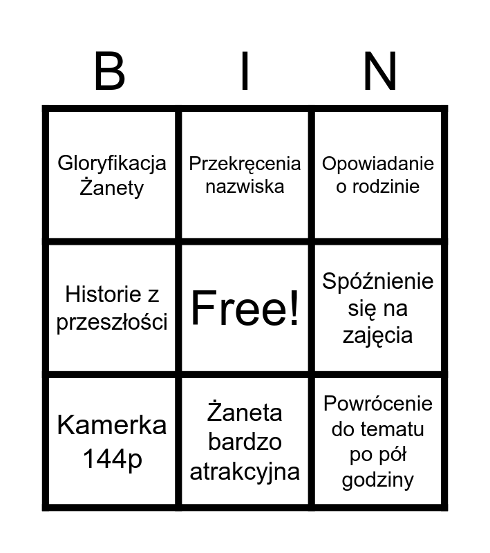 This bingo card has a free space and 11 words: To wszystko dzięki mgr. Nogajowi, Żaneta bardzo atrakcyjna, Powrócenie do tematu po pół godziny, Kamerka 144p, Przekręcenia nazwiska, Opowiadanie o rodzinie, Spóźnienie się na zajęcia, Mówienie o hajsie, Historie z przeszłości, Gloryfikacja Żanety and Magister Nogaj potem zrobi.