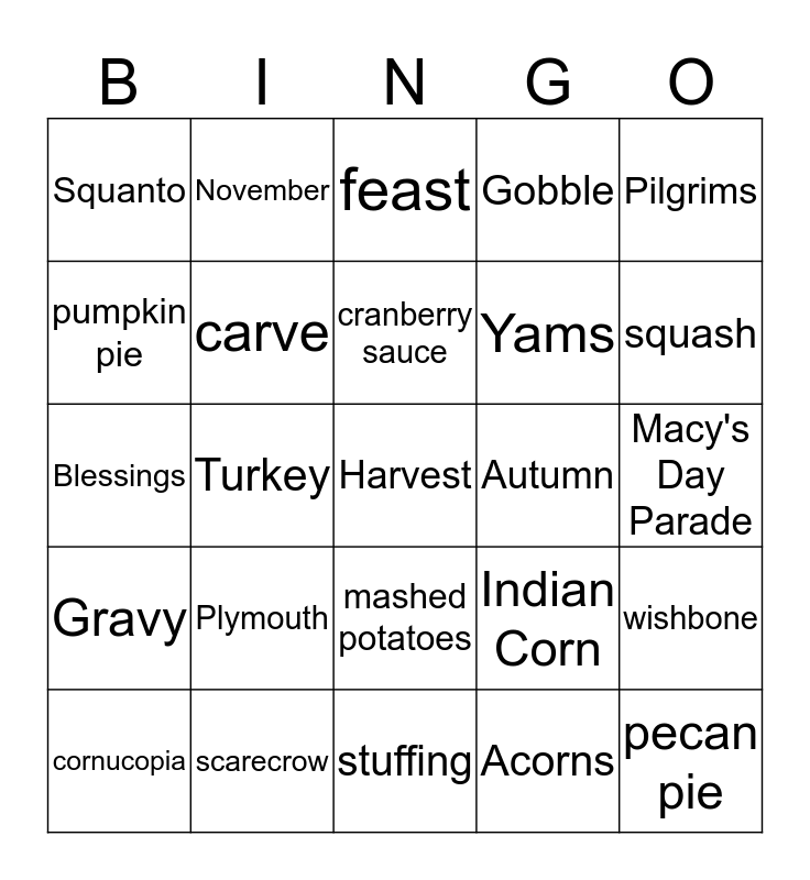 This bingo card has 25 words: Plymouth, stuffing, cranberry sauce, cornucopia, Pilgrims, Squanto, pumpkin pie, November, Autumn, mashed potatoes, Yams, Blessings, Indian Corn, wishbone, carve, pecan pie, Macy's Day Parade, feast, squash, Turkey, Harvest, scarecrow, Gravy, Gobble and Acorns.