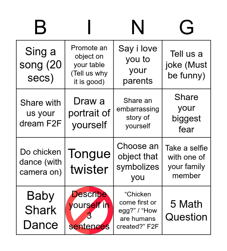 This bingo card has 1 images and 16 words: Describe yourself in 3 sentences, Take a selfie with one of your family member, Say i love you to your parents, Sing a song (20 secs), Do chicken dance (with camera on), Promote an object on your table (Tell us why it is good), Choose an object that symbolizes you, “Chicken come first or egg?” / “How are humans created?” F2F, Share with us your dream F2F, Draw a portrait of yourself, Baby Shark Dance, Tell us a joke (Must be funny), Tongue twister, Share your biggest fear, Share an embarrassing story of yourself and 5 Math Question.