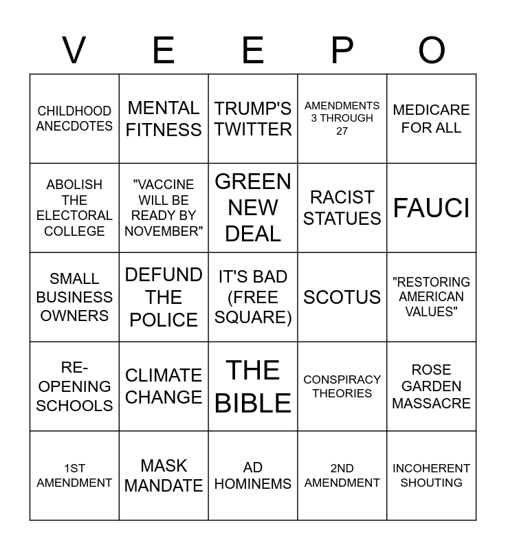 This bingo card has a free space and 24 words: CLIMATE CHANGE, MASK MANDATE, GREEN NEW DEAL, 1ST AMENDMENT, MEDICARE FOR ALL, CHILDHOOD ANECDOTES, ABOLISH THE ELECTORAL COLLEGE, MENTAL FITNESS, SCOTUS, THE BIBLE, RACIST STATUES, SMALL BUSINESS OWNERS, CONSPIRACY THEORIES, ROSE GARDEN MASSACRE, "VACCINE WILL BE READY BY NOVEMBER", 2ND AMENDMENT, "RESTORING AMERICAN VALUES", TRUMP'S TWITTER, FAUCI, DEFUND THE POLICE, INCOHERENT SHOUTING, RE-OPENING SCHOOLS, AMENDMENTS 3 THROUGH 27 and AD HOMINEMS.