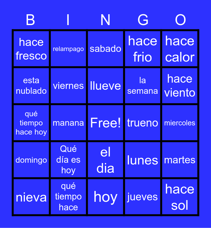 This bingo card has a free space and 24 words: Qué día es hoy, qué tiempo hace, llueve, nieva, hace calor, hace fresco, esta nublado, relampago, trueno, el dia, la semana, qué tiempo hace hoy, lunes, martes, viernes, jueves, miercoles, sabado, hace viento, manana, hace sol, domingo, hace frio and hoy.
