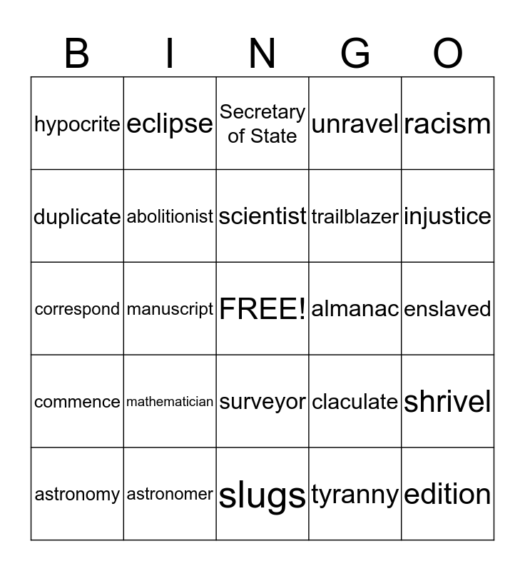 This bingo card has a free space and 24 words: mathematician, astronomer, scientist, astronomy, racism, hypocrite, duplicate, eclipse, almanac, surveyor, trailblazer, correspond, claculate, shrivel, abolitionist, tyranny, enslaved, Secretary of State, injustice, manuscript, edition, commence, unravel and slugs.
