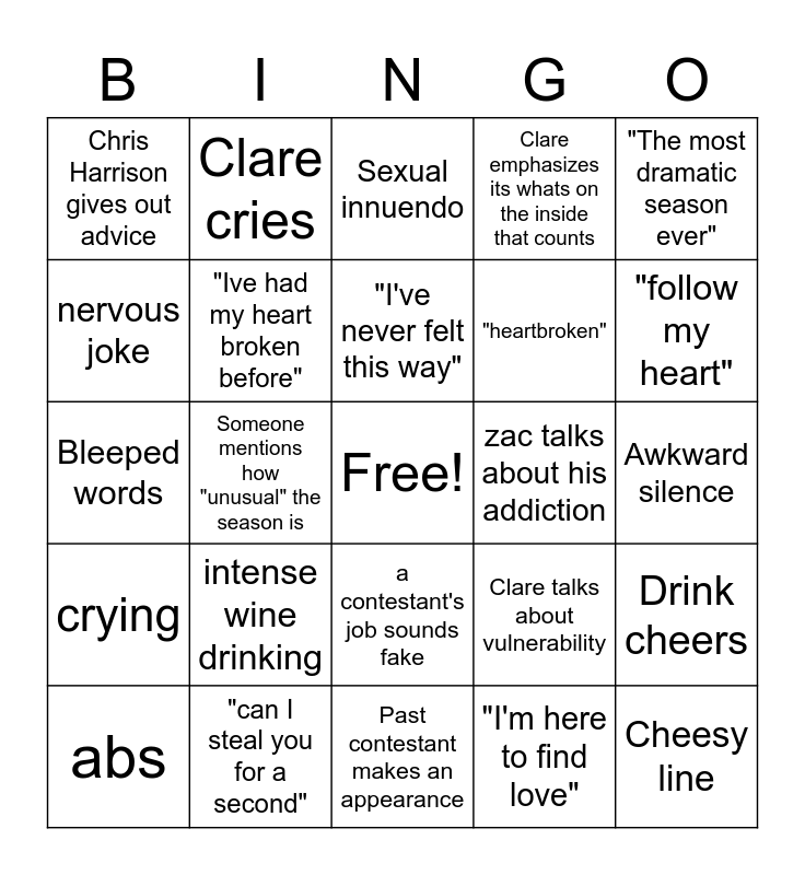 This bingo card has a free space and 33 words: Dale impresses Clare, Yosef acts like a Villian, Someone mentions how "unusual" the season is, Clare rolls her eyes, crying, "Ive had my heart broken before", "The most dramatic season ever", abs, Clare cries, kiss, "I've never felt this way", Sexual innuendo, looking afraid when Chris Harrison enters the room, one on one time interrupted, zac talks about his addiction, "follow my heart", "can I steal you for a second", Bleeped words, intense wine drinking, Clare talks about vulnerability, a contestant's job sounds fake, "Are you nervous?", Chris Harrison gives out advice, Awkward silence, Past contestant makes an appearance, Cheesy line, Clare emphasizes its whats on the inside that counts, "heartbroken", nervous joke, Drink cheers, Someone compliments Clare's dress, "I'm here to find love" and "I felt a connection".