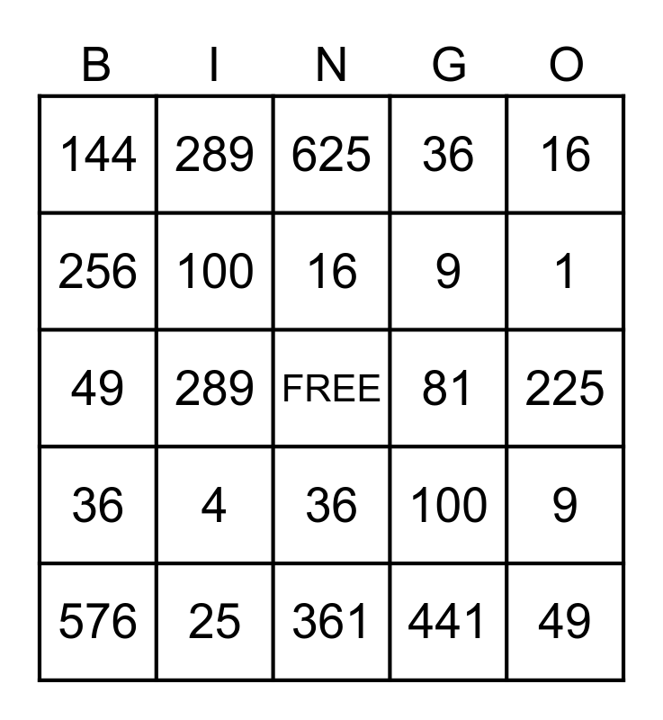This bingo card has 56 words: 9, 4, 25, 36, 49, 1, 100, 64, 81, 121, 144, 169, FREE, 196, 225, 256, 289, 625, 400, 1, 36, 25, 16, 9, 4, 49, 64, 81, 100, 121, 196, 169, 400, 625, 225, 256, 289, 36, 441, 16, 144, 324, 361, 484, 529, 576, 25, 676, 729, 784, 841, 900, 1, 4, 9 and 16.