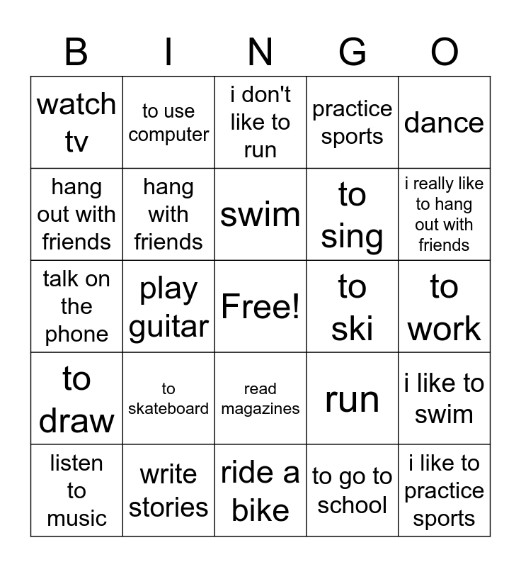 This bingo card has a free space and 24 words: to skateboard, write stories, swim, listen to music, dance, watch tv, hang out with friends, to use computer, to ski, read magazines, to sing, talk on the phone, run, i like to swim, hang with friends, to go to school, to work, i don't like to run, i really like to hang out with friends, play guitar, i like to practice sports, to draw, practice sports and ride a bike.