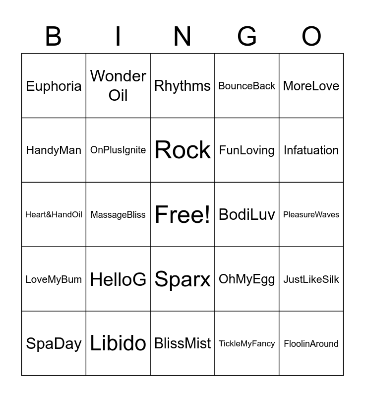 This bingo card has a free space and 24 words: HelloG, Libido, Rock, SpaDay, MoreLove, Euphoria, HandyMan, Wonder Oil, BodiLuv, Sparx, FunLoving, Heart&HandOil, OhMyEgg, JustLikeSilk, OnPlusIgnite, TickleMyFancy, PleasureWaves, Rhythms, Infatuation, MassageBliss, FloolinAround, LoveMyBum, BounceBack and BlissMist.