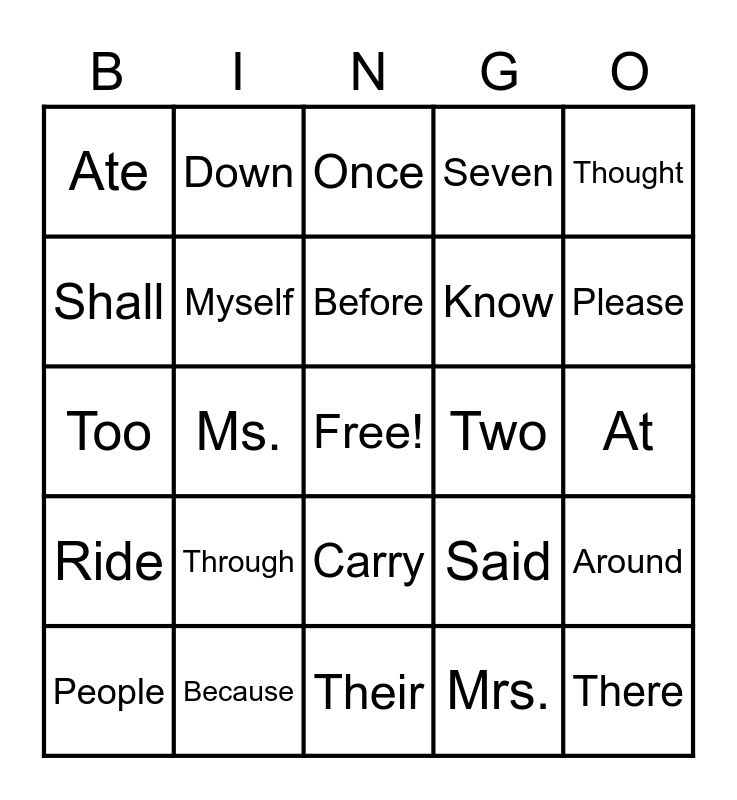 This bingo card has a free space and 24 words: Through, Because, Before, People, Thought, Ate, Shall, Down, Two, Carry, Know, Too, Said, Around, Myself, Mrs., At, Once, Please, Ms., There, Ride, Seven and Their.